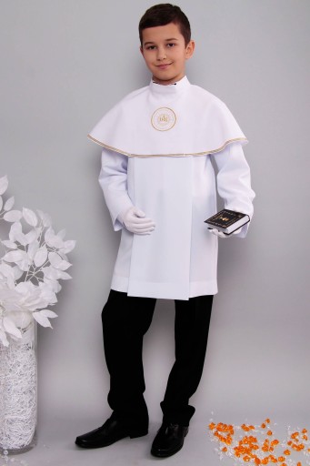 Alba jest delikatnie ozdobiona na kołnierzu biało-złotą tasiemką z motywem jodełki.
