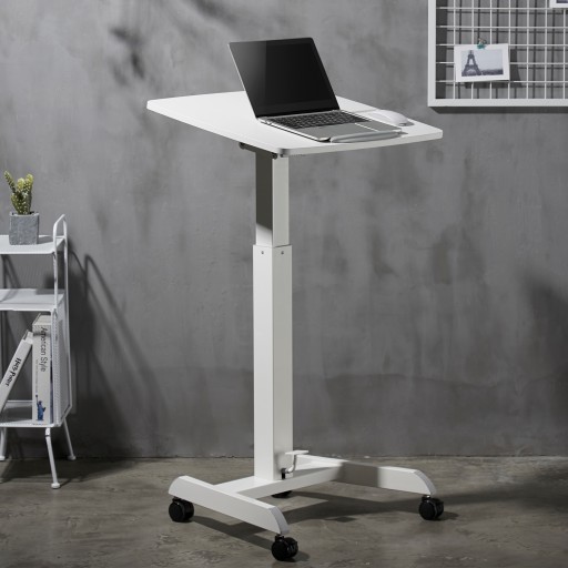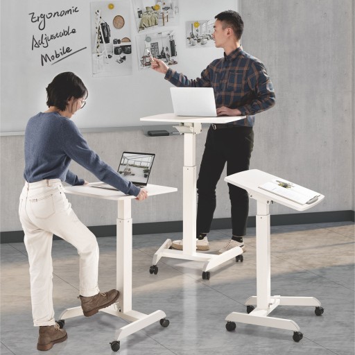 Uniwersalne biurko z pedałem do regulacji wysokości. Stół jest nie tylko praktyczny, ale także zajmuje mało miejsca – dobre rozwiązanie dla większej swobody w miejscu pracy.