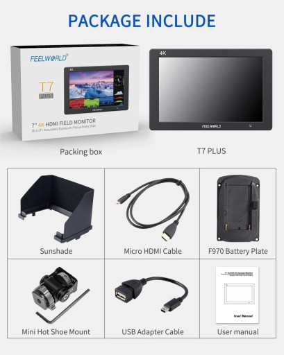 FEELWORLD T7 PLUS to 7-calowy monitor Full HD do pracy z kamerą. Posiada obudowę ze stopu aluminium, wytrzymałą; łatwy w obsłudze interfejs przycisków daje Ci pewność w działaniu; obsługuje sygnał wejściowy i wyjściowy 4K HDMI @30Hz. Dla funkcji, to uaktualnia waveform, histogram, vectorscope, 3D LUT na podstawowym T7. Zapewnia więcej kolorów i szczegółów ekspozycji obrazu, optymalizuje przepływ pracy i poprawia wydajność pracy.