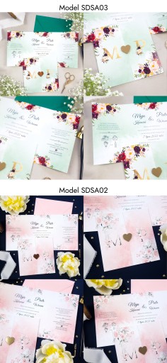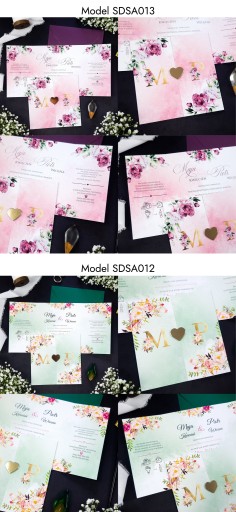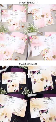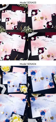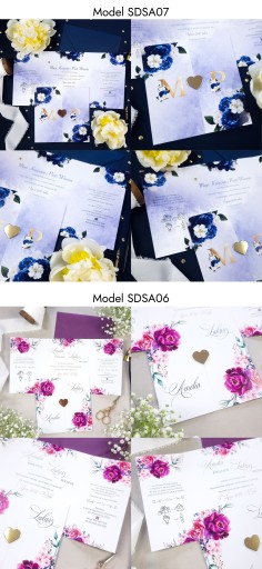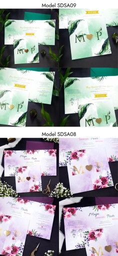 - Pewność że do zaproszeń dokupią Państwo inne elementy papeterii ślubnej (winietki, zawieszki, menu, nr stołów, magnesy, księgi gości, pudełka na koperty itp.) w motywie graficznym spójnym z zaproszeniem