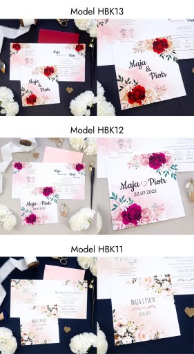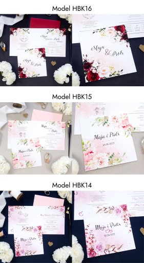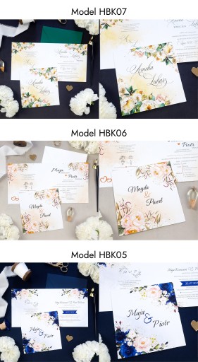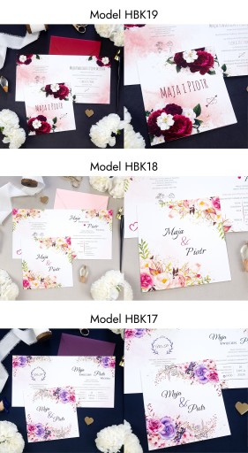 - Pewność że do zaproszeń dokupią Państwo inne elementy papeterii ślubnej (winietki, zawieszki, menu, nr stołów, magnesy, księgi gości, pudełka na koperty itp.) w motywie graficznym spójnym z zaproszeniem