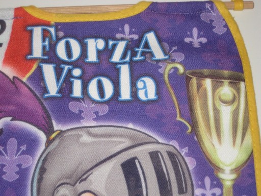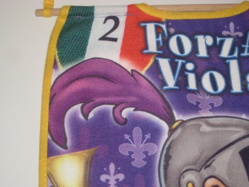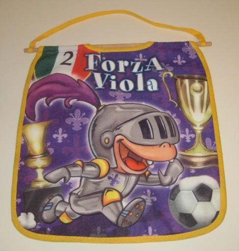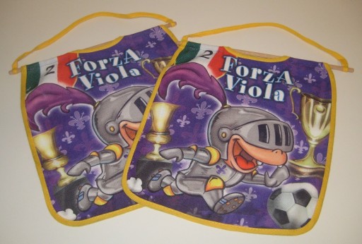 2 małe proporczyki na ścianę w barwach Fiorentiny. Przeróbka. Jednostronne. Wymiary: długość 27 cm, szerokość 24 cm. Używane. Stan jak na zdjęciach. Z Włoch. Cena za 2 szt.