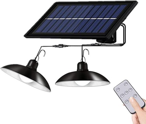 Zestaw zawiera: 2 x lampa wisząca, 1 x płyta solarna, 2 x kabel przedłużający 3M, 1 zestaw śrub, 1 x uchwyt montażowy, 1 x instrukcja obsługi (może nie być dostępna w języku polskim), 1 x pilot zdalnego sterowania.