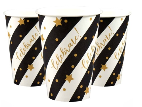 Kubeczki w biało-czarne paski ze złotymi akcentami i złotym napisem Celebrate!