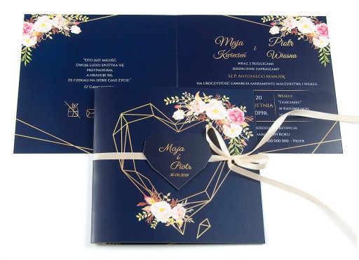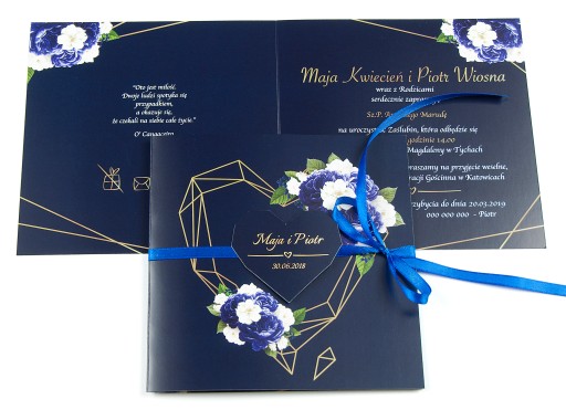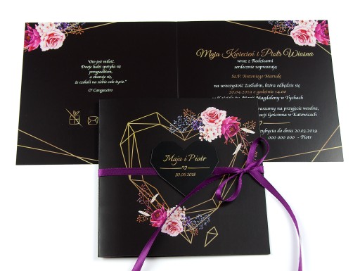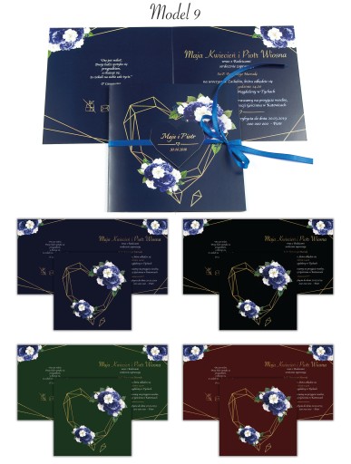 - Pewność że do zaproszeń dokupią Państwo inne elementy papeterii ślubnej (winietki, zawieszki, menu, nr stołów, magnesy, księgę gości, pudełko na koperty itp.) w motywie graficznym spójnym z zaproszeniem