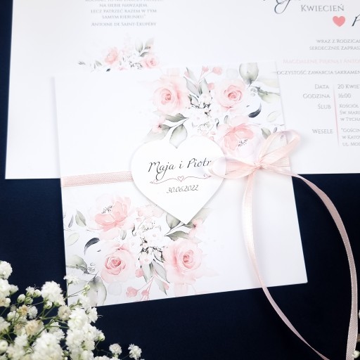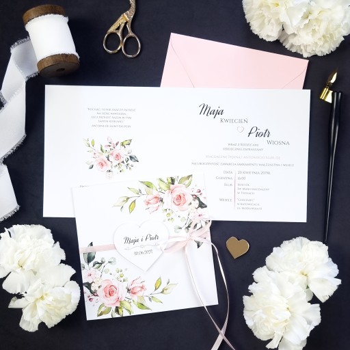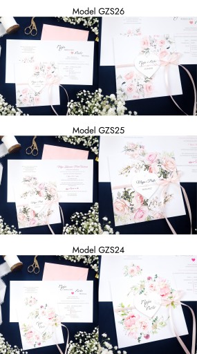 - Pewność że do zaproszeń dokupią Państwo inne elementy papeterii ślubnej (winietki, zawieszki, menu, nr stołów, magnesy, księgi gości, pudełka na koperty itp.) w motywie graficznym spójnym z zaproszeniem