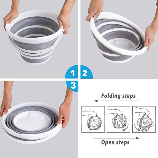 Jednym ruchem ręki wypychamy dno, aby rozłożyć wiadro, natomiast składamy je kładąc na prostej nawierzchni i dociskamy w dół brzegi wiadra.