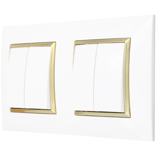 ZESTAW DWÓCH WŁĄCZNIKÓW PODWÓJNYCH ARIA W KOLORZE BIAŁYM Z RAMKĄ PODWÓJNĄ I OBRAMÓWKĄ ZŁOTĄ. MONTOWANE W STANDARDOWYCH PUSZKACH FI60 ŁĄCZONYCH.