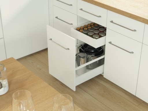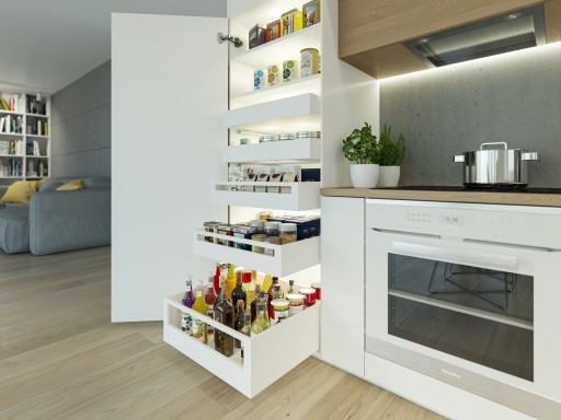 Szuflady Axis Pro oprócz niezawodności cechują się uniwersalnością użycia. Można zastosować je jako tradycyjne szuflady kuchenne, bądź coraz częściej spotykane w nowoczesnych kuchniach szuflady wewnętrzne. Aby stworzyć taką szufladę wystarczy dobrać odpowiednią do wysokości boków złączkę oraz panel przedni. Jest to idealne rozwiązane, gdy chcemy również wykorzystać maksimum dostępnego miejsca.