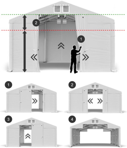 3. Otwarte główne wejścia/wjazdy oraz odpięte wszystkie ścianki z jednego boku namiotu.