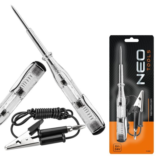 Próbnik elektryczny samochodowy NEO (nr ref. 11-832) o zakresie 6- 24 V, ze wskaźnikiem świetlnym. Umożliwia sprawdzanie przepływu prądu w instalacjach elektrychnych motocykli, samochodów osobowych i ciężarowych. Stanowi doskonałe uzupełnienie zestawu narzędzi każdego kierowcy, przydatny w warsztacie. Marka NEO spełnia oczekiwania profesjonalistów.