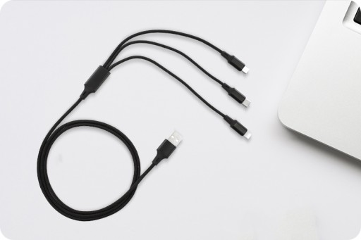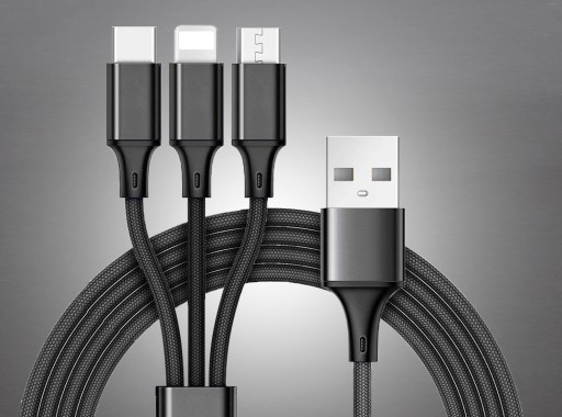 Mocny, pleciony, nylonowy kabel USB z trzema różnymi rodzajami końcówek.