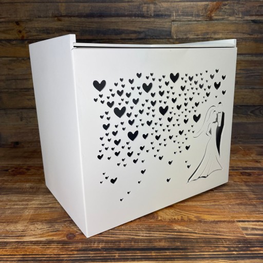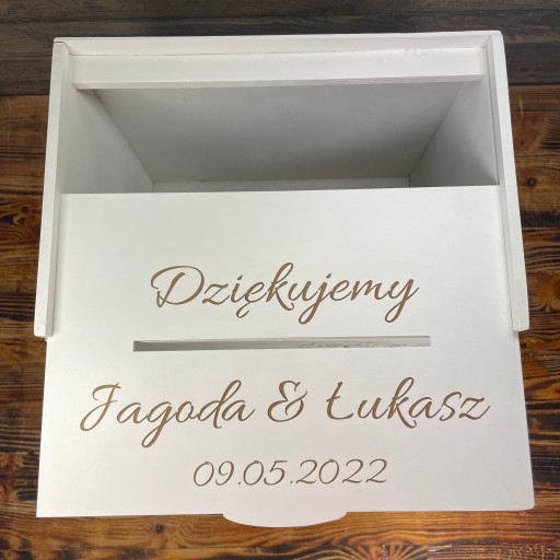 Duża skrzynia na koperty lub inne przedmioty. Idealna jako dekoracja i dodatek do wystroju sali weselnej. Świetnie sprawdzi się podczas ceremonii składania życzeń przez gości weselnych, a po wydarzeniu będzie oryginalną pamiątką tego niezwykłego dnia.