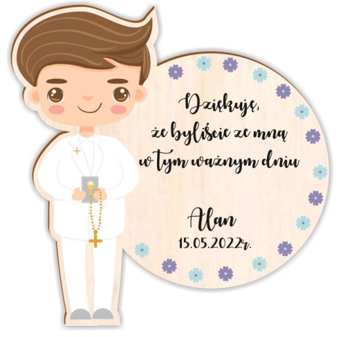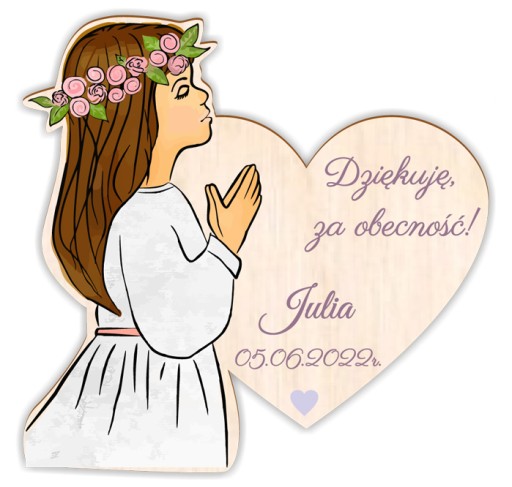 Indywidualnie spersonalizowany drewniany upominek dla gości z okazji Pierwszej Komunii.