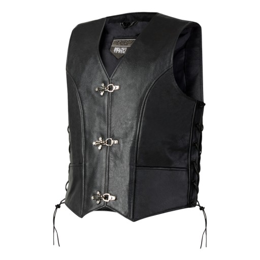 Warstwa zewnętrzna to gruba i doskonale wygarbowana skóra bydlęca, która przy odpowiedniej pielęgnacji odwdzięczy się trwającym wiele lat doskonałym wyglądem i wytrzymałością. Trwałość kamizelki zwiększają dodatkowo mocne szwy, staranne wykończenie, a także dobre jakościowo dodatki, takie jak mocne, metalowe karabińczyki czy rzemienie.
