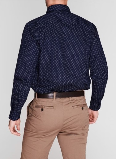 Rozmiar XL, kolory: granatowy w białe wzorki. Materiał 55% bawełna, 45% poliester. Krój: regular fit (prosty). Kieszonka na piersi.