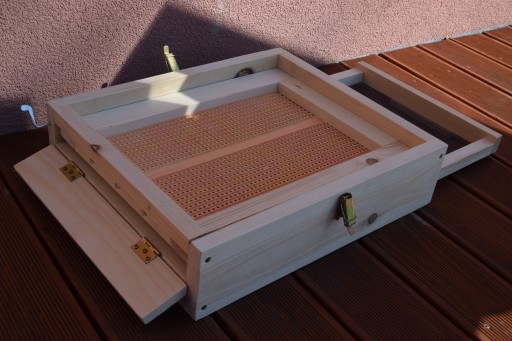 - Dennica wysoka z wyjmowanym poławiaczem pyłku z szufladą z siatką do pobierania pyłku. Dodatkowo do szuflady jest przygotowana formatka z sklejki żeby dennice były szczelne po okresie poławiania pyłku. Po zakończeniu poławiania pyłku wkładamy wycięty wylotek (jest dodawany w zestawie). Dennica ma zamontowane lądowisko na zawiasach i jest zakrętka wiedeńska która umożliwia szybkie zamknięcie dennicy i transport pszczół.
