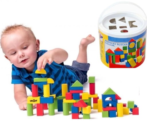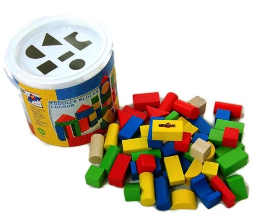 Kapitalne, drewniane klocki w wiaderku, idealne do zabawy czy to samodzielnej czy też z innymi rówieśnikami.