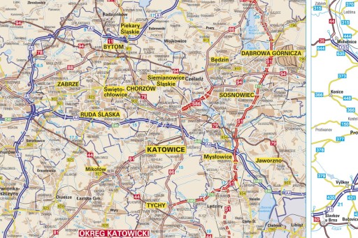 Drogi zaznaczone na mapie: - autostrady z węzłami, - autostrady w budowie i planowane, - drogi ekspresowe z węzłami, - drogi ekspresowe w budowie i planowane, - drogi główne, - drogi główne w budowie i planowane, - drogi drugorzędne, - drogi dopuszczone do ruchu ciężkiego, - drogi lokalne.