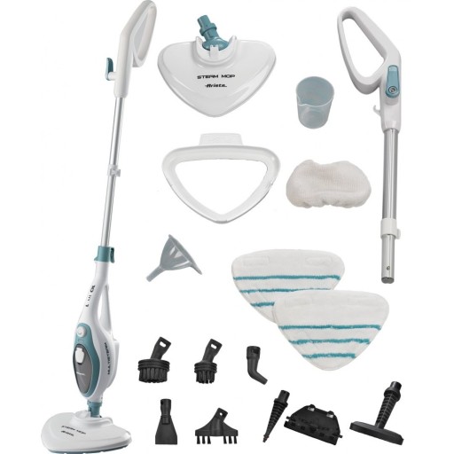 Mop i oczyszczacz parowy wielofunkcyjny 10 w 1, do czyszczenia i odświeżania podłóg, dywanów, okien, fug, tapicerki, piekarników i kaloryferów, prasowania i odświeżania ubrań, moc 1500 W, poj. 0,35 l, 18 minut ciągłej pracy, 2 szmatki, 9 akcesoriów: dwie szmatki ; końcówka do dywanów ; końcówka do materiałów (plus szmatka); końcówka do okien ; trzy różne szczoteczki (mała i duża okrągła, podłużna) ; szpachelka ; dwa stożki (prosty i zagięty)