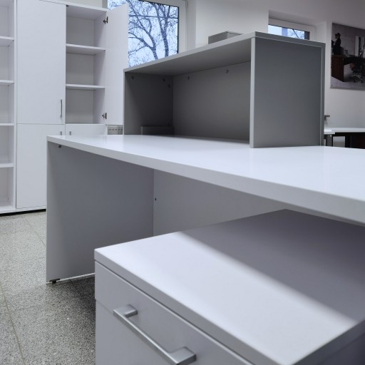 Skladbiurowy_pl oferuje ladę recepcyjną o szerokości 180cm wykonanej w całości z płyty laminowanej w kolorze białym oraz szarym. W zestawie z kontenerem białym AK52.