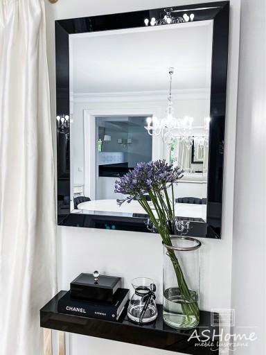 Półka została wykonana także z lacobelu w kolorze czarnym i zamocowana 14 cm nad posadzką. Mocowanie półki jest solidne i stabilne, bo również na stelażu chrom. Poprzeczne wzmocnienia, na których płożona jest półka, są bardziej dyskretne, i stelaż ma wymiary 3,5 cm x 3,5 cm. Dodatkowo półka posiada prosty system, który ogranicza jej przesuwanie i stabilizuje na miejscu, dając pewność, że się nie zsunie. Stelaż konsoli i półka do samodzielnego montażu. Do mebla dołączony jest druk z wytycznymi do złożenia lustrzanej konsolki. Montaż jest bardzo prosty, a klienci nie mają z nim najmniejszych problemów. Wystarczy jedynie wkręcić nogi, które mają już przymocowane odpowiednie końcówki, aby można było w dalszym etapie nasadzić poprzeczki i położyć na nich półkę.