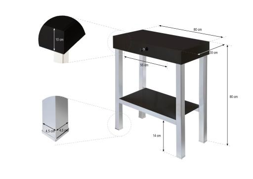 Blat wykonany jest z precyzyjnie wyszlifowanego czarnego lacobelu, ma grubość 10 cm. Posiada szufladę, a na jej środku przymocowany wyrafinowany i elegancki uchwyt- kryształowa gałka, u podstawy chromowana. Szuflada na życzenie klienta na dnie może zostać wykończona skórą. Szerokość szuflady przy konsolce szerokości 80 cm, wynosi 55 cm. Całość osadzona została na subtelnym i ekskluzywnym stelażu pokrytym chromem, którego profil jest kwadratem 4,5 cm x 4,5 cm, odpornym na upływ czasu. Inspiracją do opracowania stelaża, który jest obrysem konturów, były tradycyjne meble codziennego użytku.
