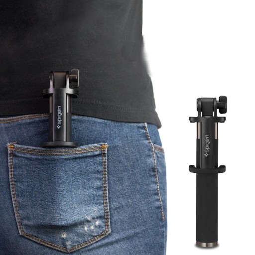 Rewelacyjny selfie stick marki Spigen. Wysięgnik wykonany z wysokiej jakości aluminium z gumowymi uchwytami w celu zapewnienia jak największej wytrzymałości oraz wygody użytkowania. W uchwycie znajduje się wbudowany przekaźnik Bluetooth, oraz bateria. Po sparowaniu urządzeń za pomocą funkcji Bluetooth wystarczy nacisnąć guzik na rączce i wykonać zdjęcie.