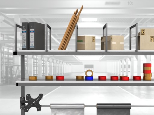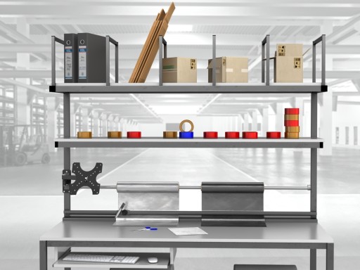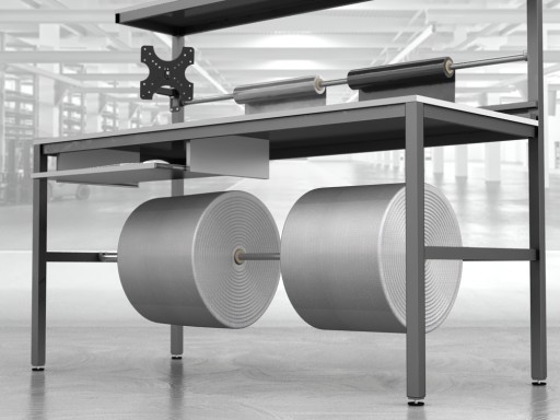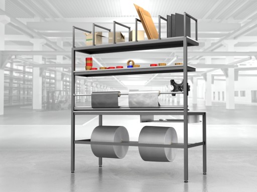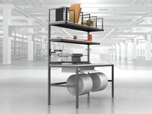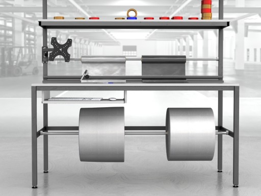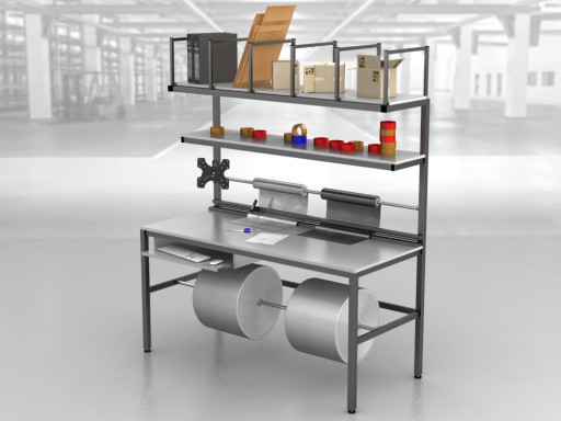 Wysokiej jakości stół warsztatowy do pakowania paczek wykonany z profili metalowych spawanych w stabilną bryłę.