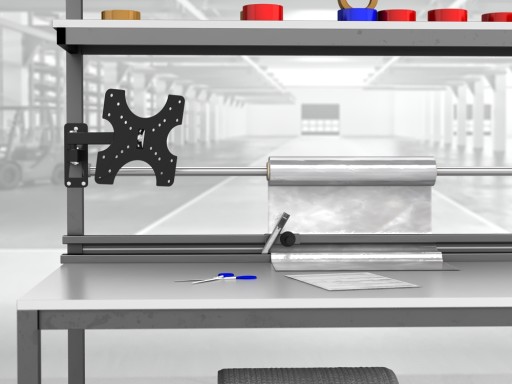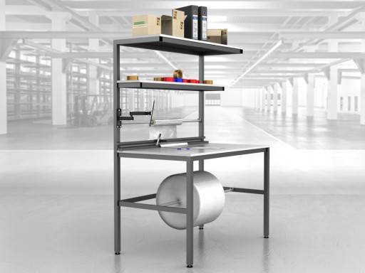 Wysokiej jakości stół warsztatowy do pakowania paczek wykonany z profili metalowych spawanych w stabilną bryłę.