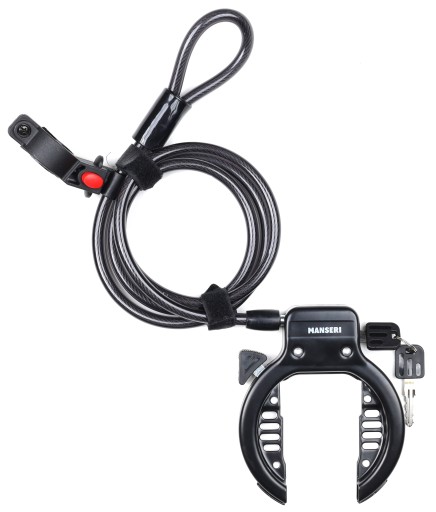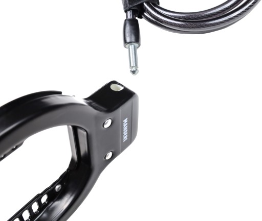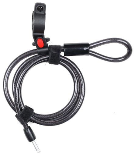 W zestawie linka do dodatkowego zabezpieczenia roweru wraz z uchwytem do przewozu