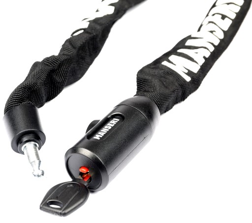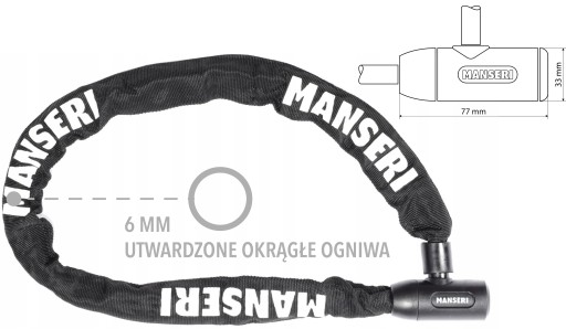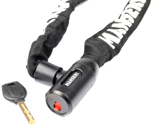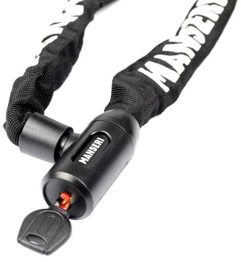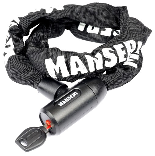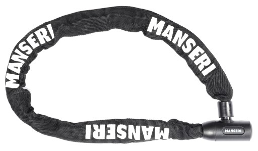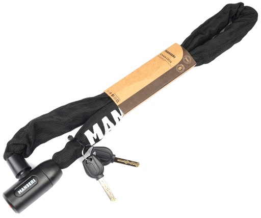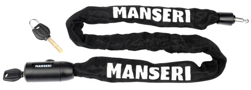 Hartowany łańcuch MANSERI o długości 90 cm umożliwia bezpieczne i uniwersalne zablokowanie roweru w praktycznie każdych warunkach.