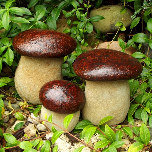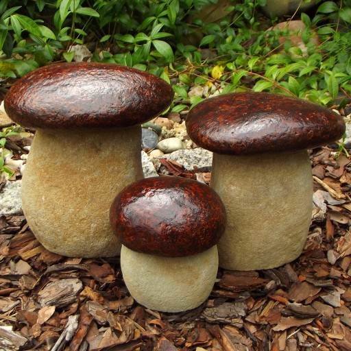 Ozdoba do ogrodu grzyby. Zestaw trzech dopasowanych do siebie grzybów ogrodowych wykonanych z naturalnego kamienia. Figurki są odporne na warunki atmosferyczne. Doskonała dekoracja na skalniak, rabatę czy pod iglaki. Każdy zestaw jest troszkę inny ponieważ wykonany jest z naturalnych kamieni otoczaków.