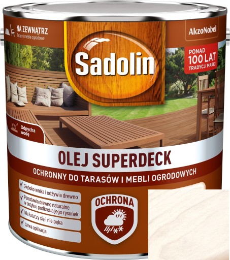 Sadolin Olej Superdeck do mebli i tarasów to nowoczesny olej o dużej zawartości żywic przeznaczony do konserwacji i dekoracji tarasów drewnianych oraz mebli ogrodowych, a także innych powierzchni drewnianych na zewnątrz.
