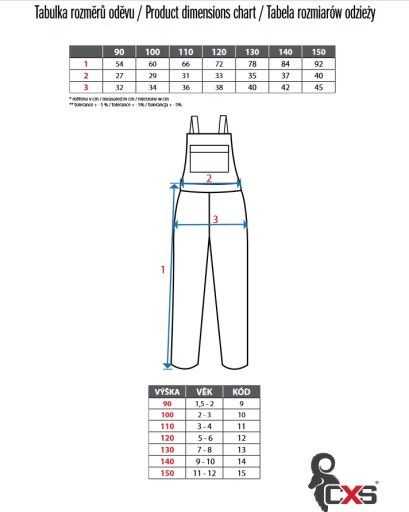 z guzikiem do dostosowania rozmiaru, kieszenie klinowe z przodu, zwykła kieszeń z tyłu, wzmocnione kolana, szelki z tyłu na