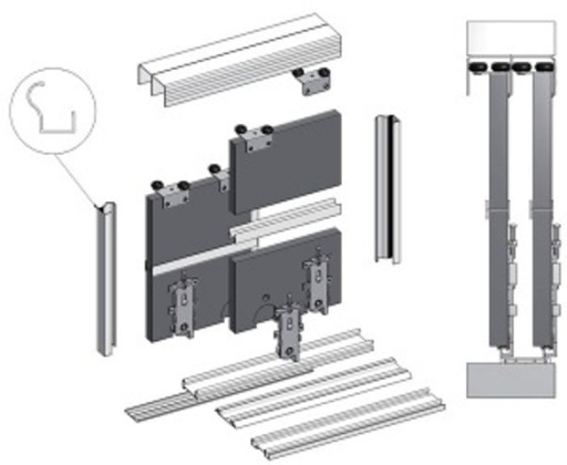 System EURO jest to prosty, tani i łatwy w montażu system drzwi przesuwnych do zastosowania w szafach i garderobach. System ten stosuje się z płytą o grubości 18 mm. Maksymalny ciężar skrzydła to 50kg.