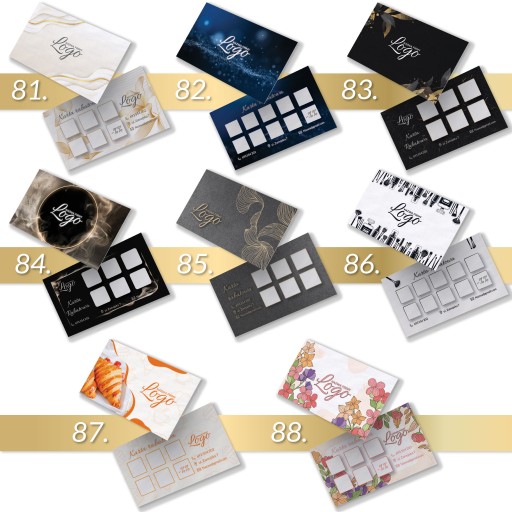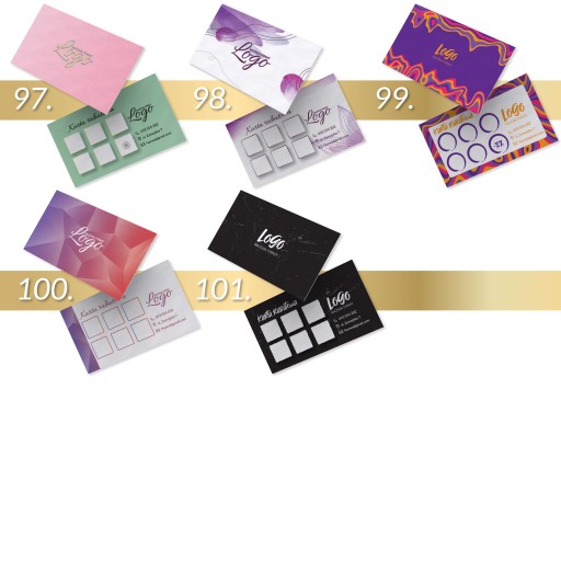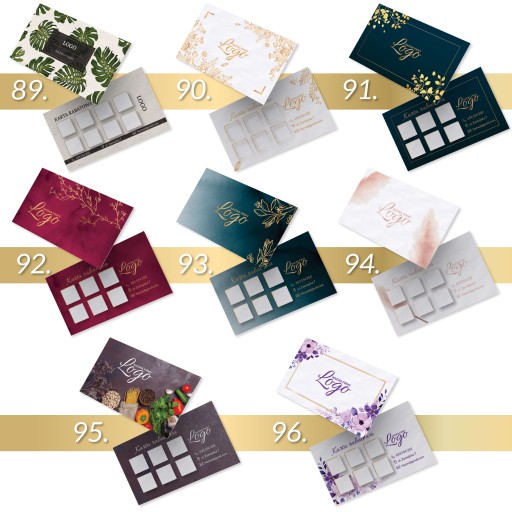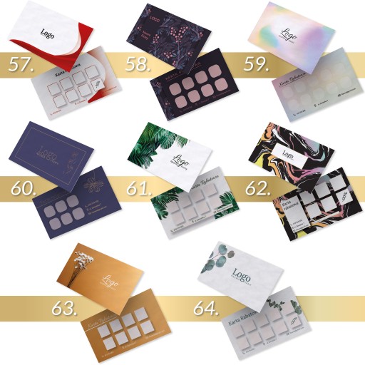 Najpierw wybierz wzór karty, następnie na pierwszej stronie zamieść swoje logo + tekst. Na drugiej stronie masz możliwość modyfikacji pól na pieczątki (ilość, kształt, kolor) oraz zmianę ikonek (telefon, kontakt, lokalizacja, strona www, social media).