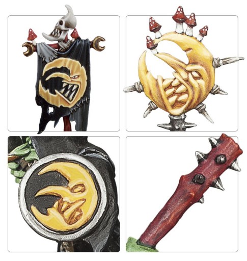 W zestawie znajdziesz wystarczająco dużo dźgnięć, włóczni i tarcz księżycowych, aby zbudować jednostka Stabbas lub wystarczająca liczba łuków i szczelin Moonclan, aby zbudować jednostkę Shootas. Znajdziesz również wybór Nosicieli ikon, Gong Basher, 2 sieci kolczaste i specjalną stabbę do oznaczenia bossa Moonclan.Ten zestaw jest dostarczany ze 111 komponentami i zawiera okrągłe podstawy 20 x 25 mm.