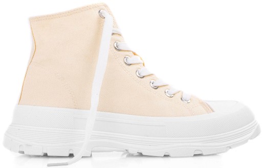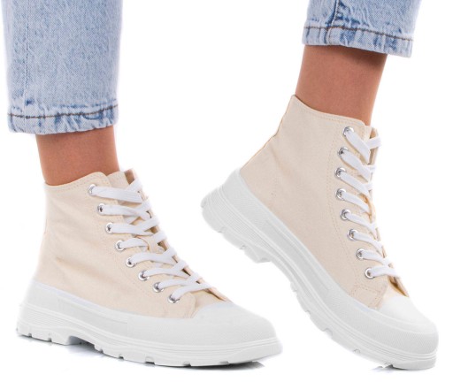Damskie wysokie buty sportowe a'la trampki. Wykonane z materiału tkaninowego na grubszej, wygodnej podeszwie z platformą. Model ze sznurowaną cholewką, tkaninowa wkładka.