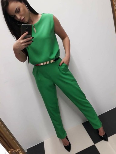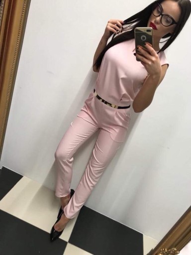 Elegancki, dopasowany kombinezon z długimi nogawkami. Na plechach kryty suwak. Po bokach kieszonki, W zestawie nie ma paska. Produkcja polska