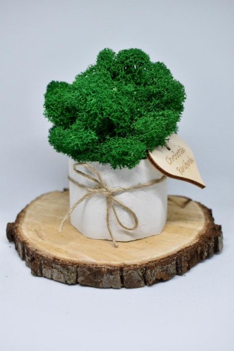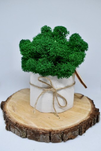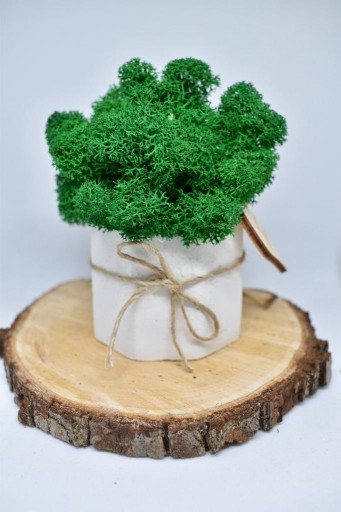 Wymiary ( 5cm x 5cm x 5cm wymiary doniczki bez mchu ok 5-6cm mech) z najwyższej jakości zielonego w kolorze: ciemnozielony- zieleń butelkowa ( jednokolorowego), gęstego i naturalnie impregnowanego fińskiego mchu chrobotek reniferowy. Doniczka wykonana ręcznie z betonu architektonicznego.