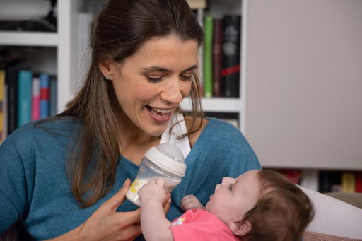 Kształt smoczka w butelce NaturalFeeling wspomaga prawidłową pozycję dziecka podczas karmienia.