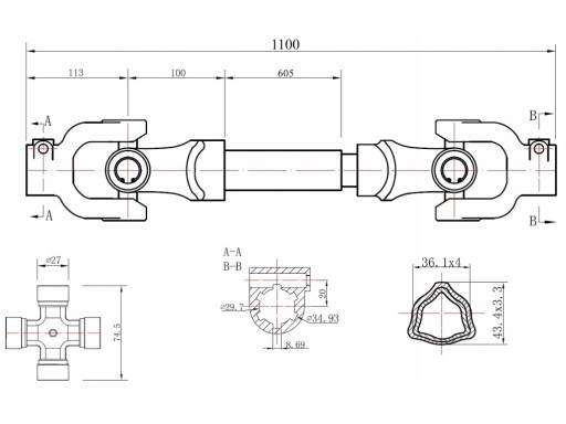 - Przeguby krzyżakowe: 27 x 74.5 mm