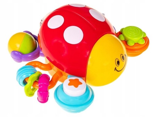 Każda z 6 nóg biedronki posiada inną zabawkę dzięki czemu rozwija także zdolności manualne, słuchowe i poznawcze dziecka.