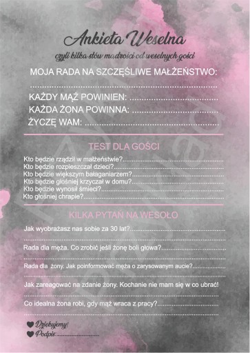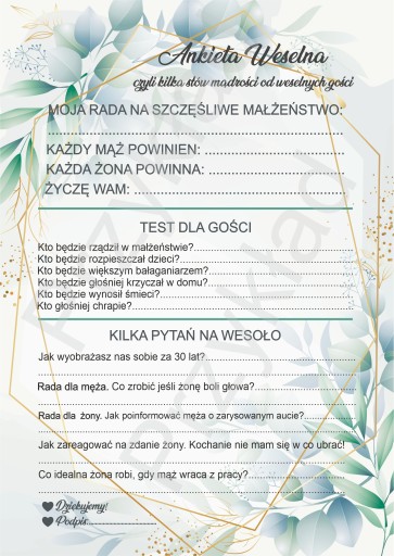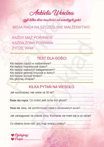 Ankieta weselna 1 kpl = 4szt A5.