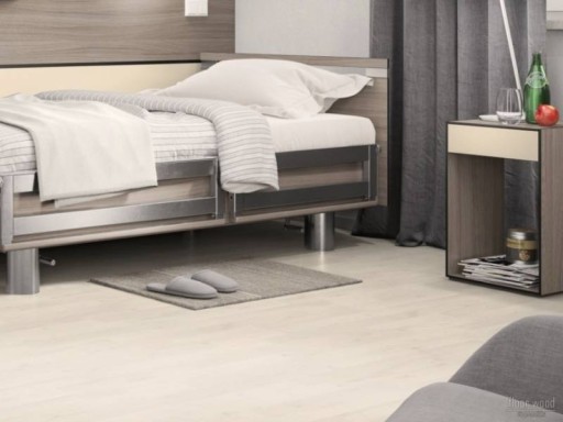 Dąb polarny to laminat w bardzo jasnym kolorze, imitujący drewnianą podłogę klepkową z pojedycznymi pęknięciami i sękami.
