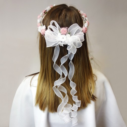 WIANEK wykonany jest z tworzyw sztucznych. Składa się z różowych i białych różyczek z dodatkiem zielonego oraz połyskujących cyrkonii. Z tyłu wianka upięta jest śliczna kokarda, z której spadają kręte tasiemki opadające wzdłuż włosów.