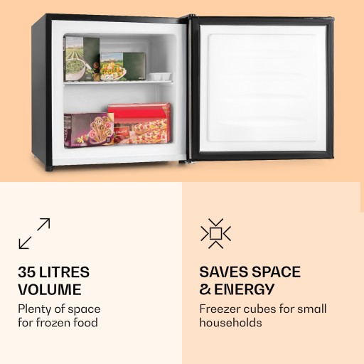 Czterogwiazdkowa komora o pojemności użytkowej 35 litrów oferuje dużo miejsca zarówno na większe, jak i mniejsze pojemniki. Wysuwając kratki, zyskujemy więcej miejsca do przechowywania wysokich przedmiotów - np. butelek. Moc zamrażania może być regulowana w zakresie od -18 do -24 °C za pomocą regulatora obrotowego. Moc wejściowa zamrażarki wynosi 65 W, co plasuje ją w klasie energetycznej F. Moc ta jest wystarczająca do głębokiego zamrożenia 1,8 kg żywności w ciągu 24 godzin.