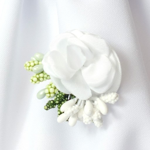 WIANEK wykonany jest z tworzyw sztucznych. Składa się z gęsto przeplatanych drobnych kwiatuszków białych i dodatku zielonego. Z tyłu wianka upięta jest piękna kokarda, z której wychodzą liczne tasiemki, układające się wzdłuż włosów.