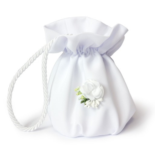 TOREBKA typu woreczek/sakiewka z ozdobnym marszczeniem oraz przypinką kwiatową. Do torebki umocowany jest gruby ozdobny sznur, do dłoni. W torebce swobodnie zmieści się książeczka do modlitwy, różaniec, chusteczki.